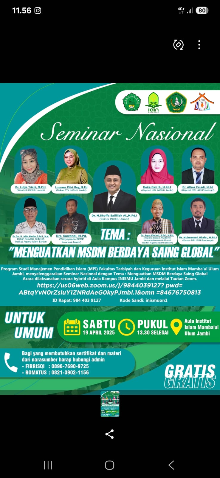 Jambi 19 April 2025. Fakultas Tarbiyah dan Keguruan, Program Studi Manajemen Pendidikan Islam (MPI) Institut Islam Mamba’ul Ulum (Inismu) Jambi sukses menyelenggarakan Seminar Nasional bertema “Menguatkan Manajemen Sumber Daya Manusia (MSDM) Berdaya Saing Global”. Acara yang digelar di Aula Utama Inismu ini menghadirkan para akademisi dan praktisi pendidikan sebagai pemateri utama.